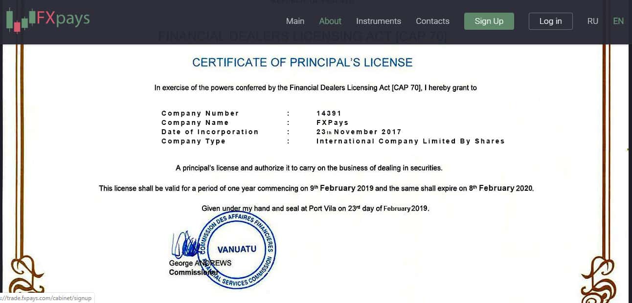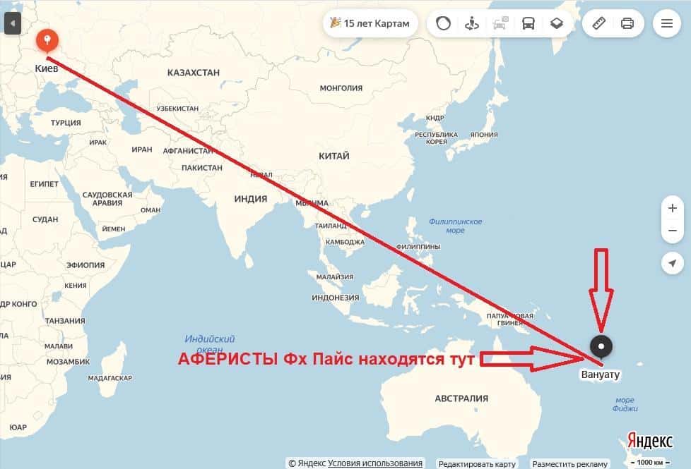 На своем сайте аферисты ФХ Пайс выставили лицензию, которая не внушает вообще никакого доверия. Такая лицензия все равно, что филькина грамота, поскольку выдана была в Вануату. Как мы знаем - это офшорная зона, а лицензии от Центрального Банка РФ у жуликов, конечно же, нет.