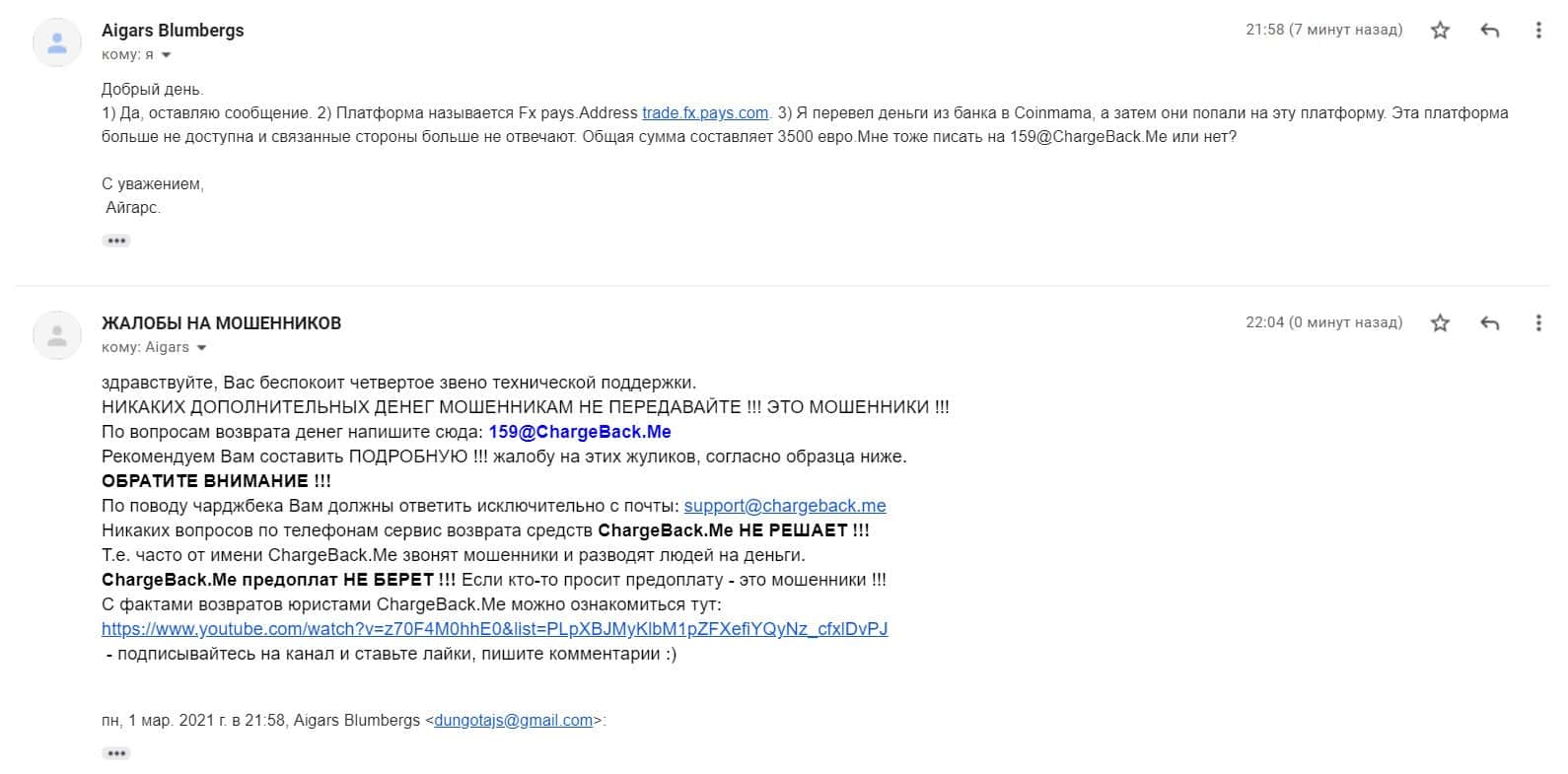 На публикации предоставленной ниже предлагаем ознакомиться с жалобой о том, как мошенники Фх Пайс и Коин Мама действуя сообща кинули клиента на 3500 евро.