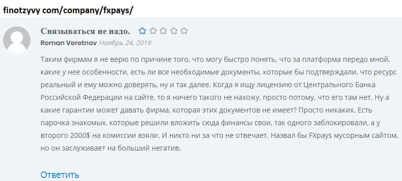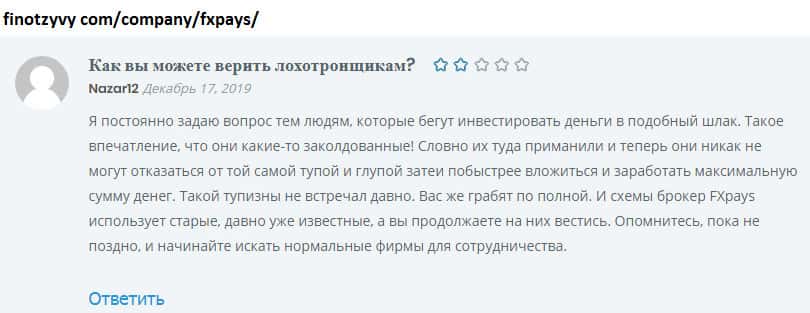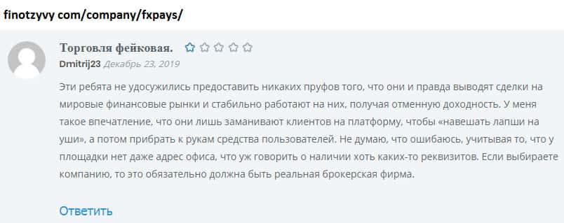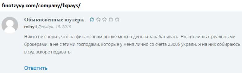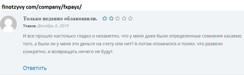 Опытный трейдер может отличить действительно торговую платформу от лохотрона. ФХ Пайс относится ко второму. Трейдер, детально изучивший информацию о FXPays, понимает, что шаражкина контора может его легко кинуть на деньги. Но не все такие бдительные, есть пользователи, которые по наивности лишились около 2000$.