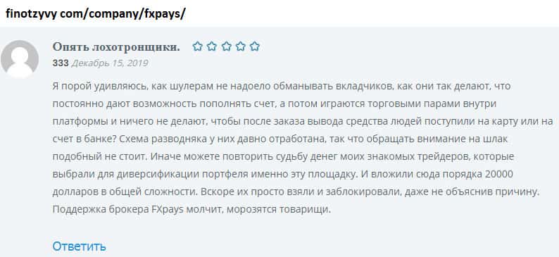 Классическая схема лохо-контор - это заблокировать своего пользователя без объяснения на то причин. Трейдеры между собой делятся подобной информацией, чтобы у аферистов не было новых наивных жертв для развода. FXPays активно кидают пользователей на крупные суммы. По последнему отзыву очередная схема аферистов была на 20 000$.
