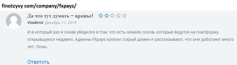 Такие жулики как FXPays, имеют богатый опыт облапошивания честных граждан. Обманутые пользователи не раз признавались, что не могли до последнего поверить, что контора FXPays их развела и кинула. Настолько профессионально действуют жулики! Никогда не теряйте бдительность даже если вам кажется, что брокеру можно доверять.