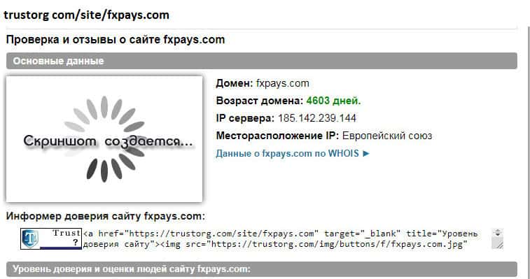 В сети существует очень удобный ресурс для проверки лохо-контор. Каждый желающий может зайти на доверие в сети и узнать историю того или иного домена. После проверки официального сайта FXPays выяснилось, что возраст домена около 12 лет. Сразу становится понятно, что это шаражкина контора.