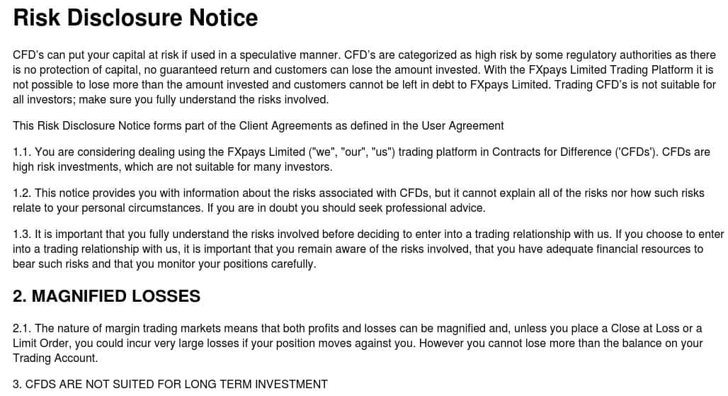 Контора FXPays своим клиентам пропихивает под видом клиентского соглашения заявление о раскрытии рисков. Совсем одно и тоже, но вот так мошенники издеваются над своими вкладчиками. В любом случае, без нормальной лицензии даже реальное клиентское соглашение не имеет никакой юридической силы.