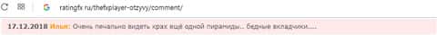 Автор следующего отзыва больше чем уверен, что мошенники The FX Player доживают свои последние дни, так как все чаще и чаще стали не выводить деньги своим клиентам. Причину отказа они не объясняют, но правда в том, что все кто вложился в брокерскую контору ФХ Плеер, назад деньги уже вернуть не сможет.