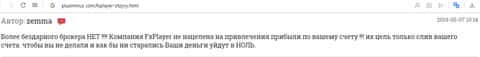 Еще один отзыв найден в интернете, где человек жалуется на лохотрон под названием ФХ Плеер. Клиент искал брокера, который предоставляет софт для торговли на рынке Форекс через КПК. Но все дела пошли плохо, когда он стал торговать на реальном счете. Он пытался добиться решение проблемы в службе поддержки, но все безуспешно.