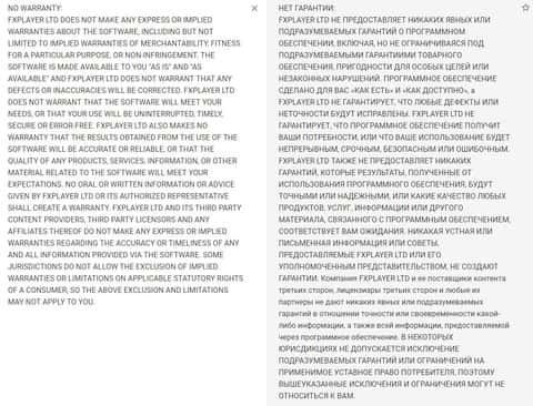По поводу договора, который предлагает ознакомиться нас лохотрон ФХ Плеер, здесь можно сказать следующее. Контора не дает гарантии, что программное обеспечение и услуги будут работать без сбоев и соответствующего качества. В случае потери денег из-за возникших проблем, жулики The FX Player не несут ответственности.