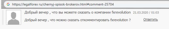Такой крик души был недавно. Пользователь запрашивает информацию об мошеннической конторе FXRevolution io на одном из сайтов в сети. Но никто не ответил пока что на данный запрос о помощи с информацией о конторе. Это единственный комментарий, который был на данном форуме. Более, комментариев и запросов о мошеннической шараге абсолютно нет.