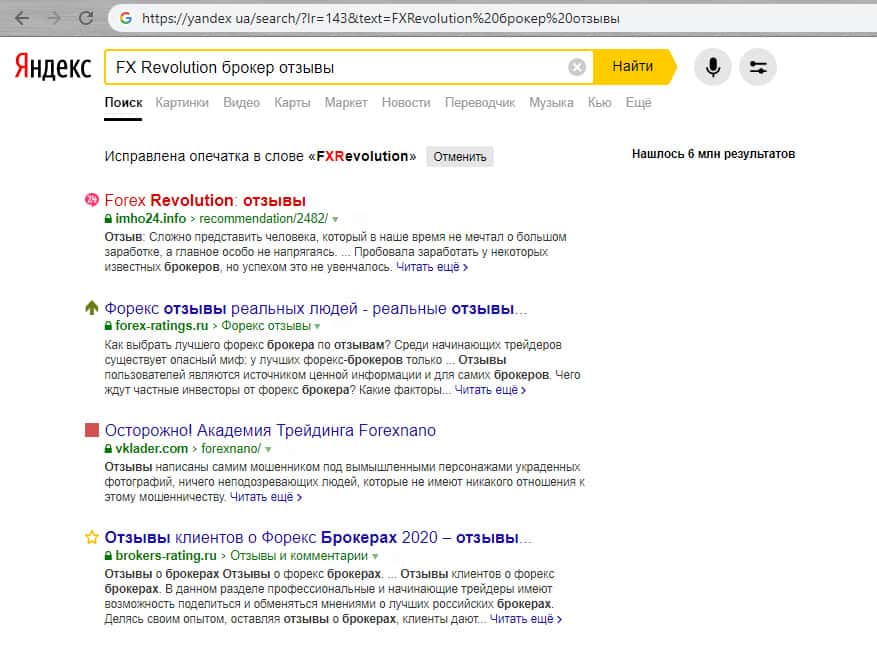 Также, взглянем на предоставляемую информацию в поисковой системе Яндекс. Здесь, также как и с Гугл Хром нет нормальной информации об данном псевдоброкере. Только несколько сайтов с крайне малым количеством информации, которую невозможно вставить в данную статью. Всё же, вполне возможно, что шулера из криптоконторы ФХ Революшн скрываются.
