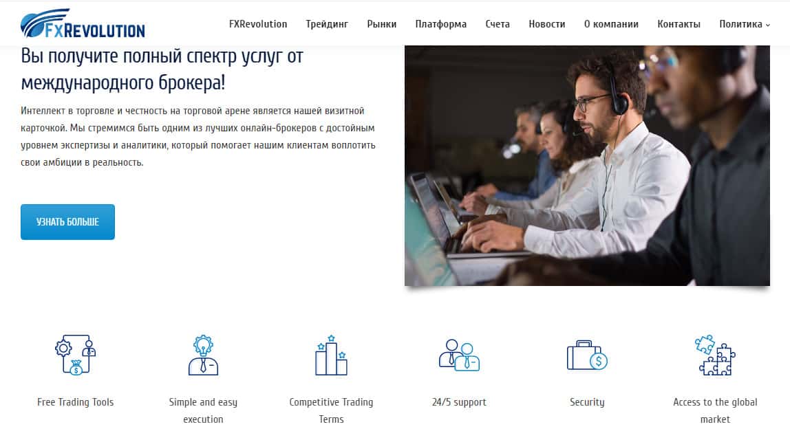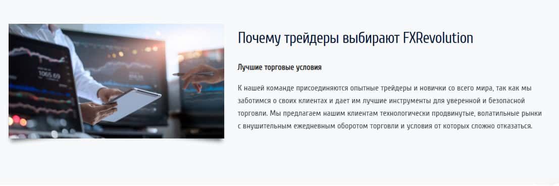 Мошенническая контора FXRevolution io обещает Вам только честную и надежную торговлю на их официальном сайте и платформе. Жаль, правда, что это ложь и провокация на то, чтобы Вы начали торговать вместе с ними и сливали денежные средства в их карманы, которые всегда открыты для Ваших денег и никогда не закрываются, не смотря ни на что на белом свете.
