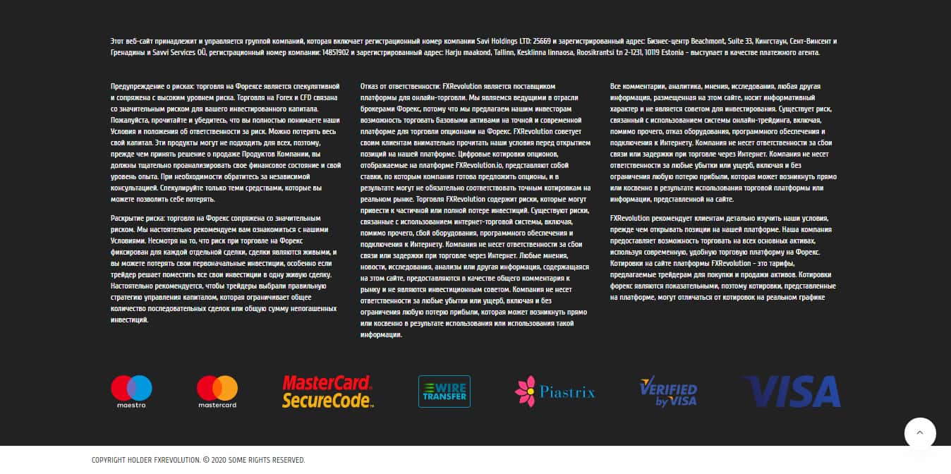 В конце мошеннического сайта конторы под названием FXRevolution io размещена некоторая интересная информация по поводу того, где зарегистрирована данная контора и предупреждения о рисках. Всем известный факт, что так или иначе, Вы имеете риск потерять денежные средства. Но потерять и украсть разные понятия, которые данной конторе совсем не интересны.