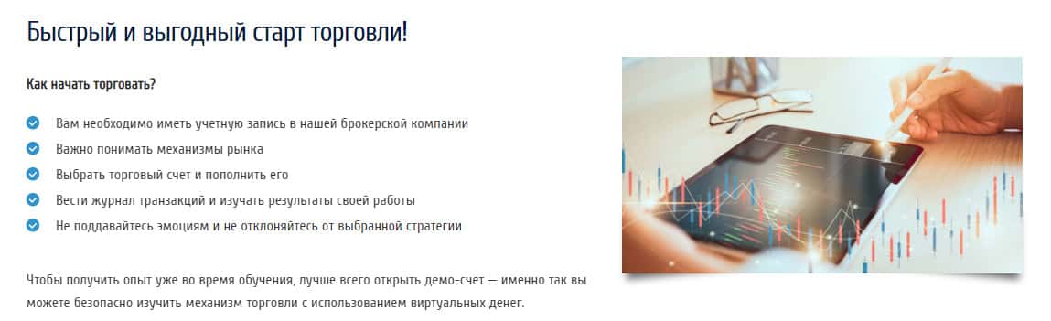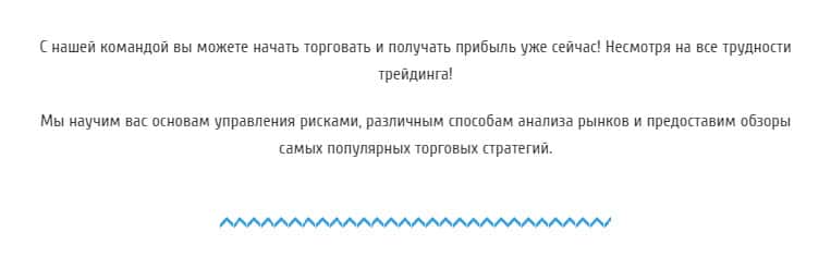 В начале вкладки со статьей о трейдинге на сайте мошеннической конторы FXRevolution io всё начинается с нахваливания самих себя, мол, они самые лучшие, что с их компанией Вы можете начать торговать и получать прибыль не отходя от кассы, даже не обращая внимания на все трудности связанные с трейдингом. Также, мошенники обещают обучить Вас торговать.