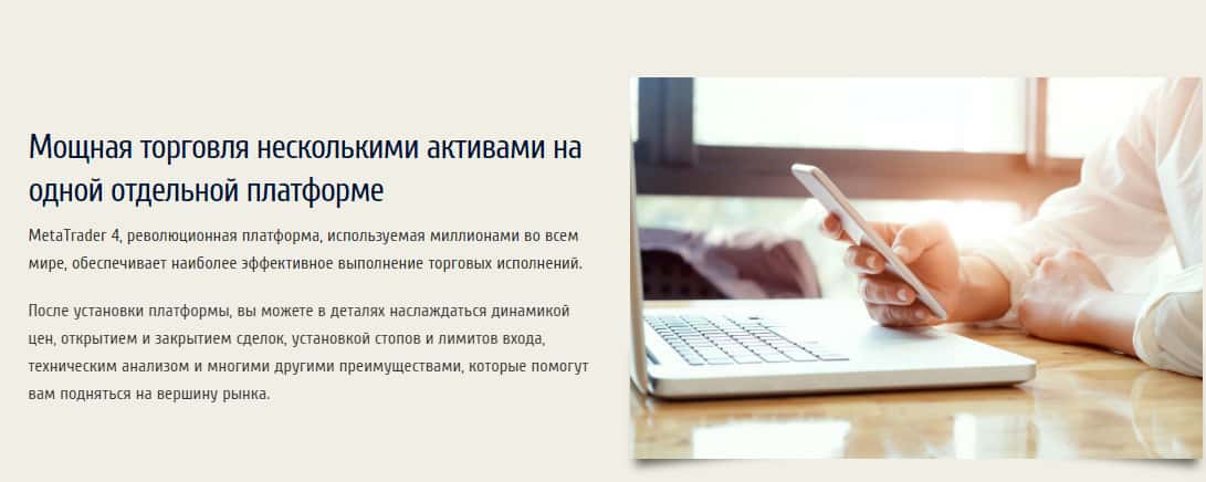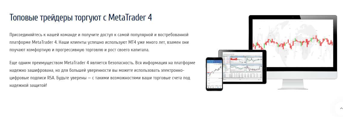 Мошенническая контора использует платформу МетаТрейдер 4, для "торговли" на сайте. В данной платформе нет ничего плохого, но она несколько хуже МетаТрейдер 5, которая выполнена более качественно и не имеет такого большого количества дыр в системе как МТ4. Тем не менее, мошенники могут использовать данную платформу для мошенничества в сети.