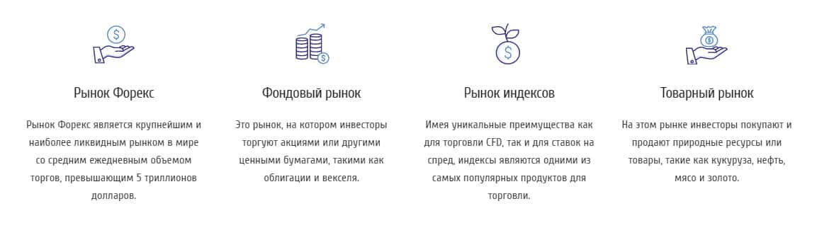 Рассмотрим по ближе вкладку о видах рынков на официальном сайте мошеннической организации ФХ Революшин. В начале статьи не говориться ничего путнего по поводу торговых рынков, а только то, что Вы должны полагаться на свой опыт, который заработали при работе с другими брокерами. Также, говориться о знании рынков и прочей информации которая ясна.