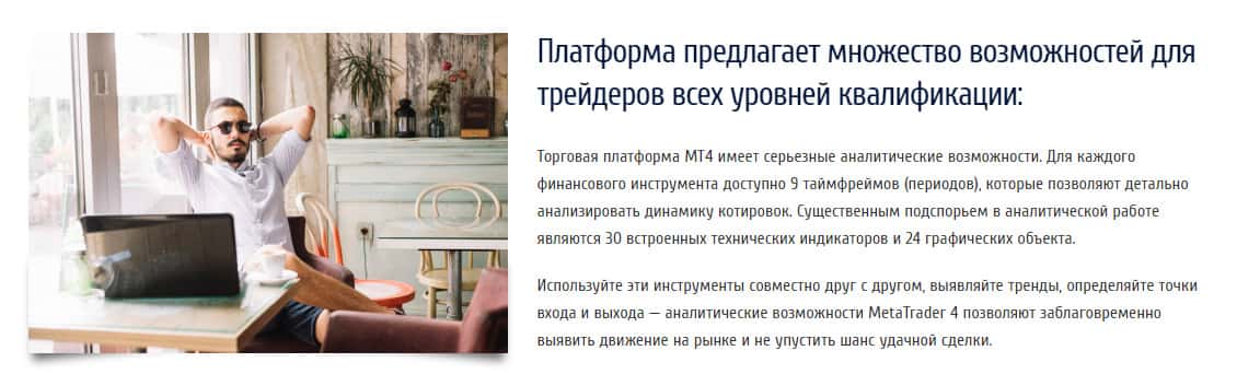 Далее, немного ниже, мошенники рассматривают все положительные стороны для прекрасной работы и приманивания пользователей в свою шарашкину контору. Лохотрон ФХ Революшин обещает Вам, что у Вас будет расширенный технический анализ, гибкая торговая система, в чем можно сомневаться, глядя на сайт конторы, консультации от неизвестных экспертов.