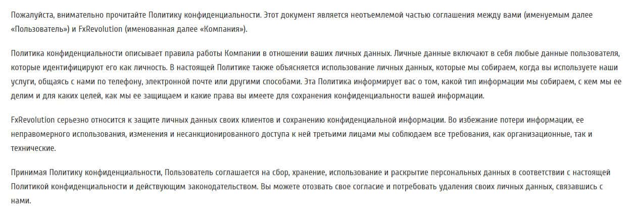Перед тем, как Вы погрузитесь в шок, всё начинается с слов о том, что Вы обязаны прочитать политику конфиденциальности, что будет крайне правильным поступком в любом случае. Мошенники из преступной конторы FXRevolution io рассказывает байки о том, что они серьезно относятся к конфиденциальным данным, которые Вы им предоставляете на их сайте.