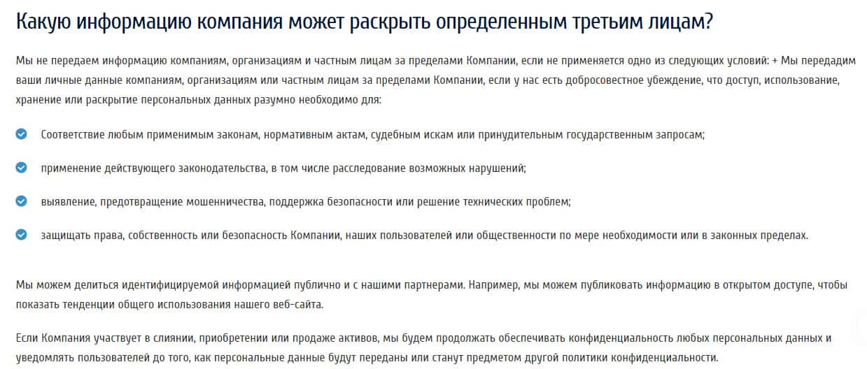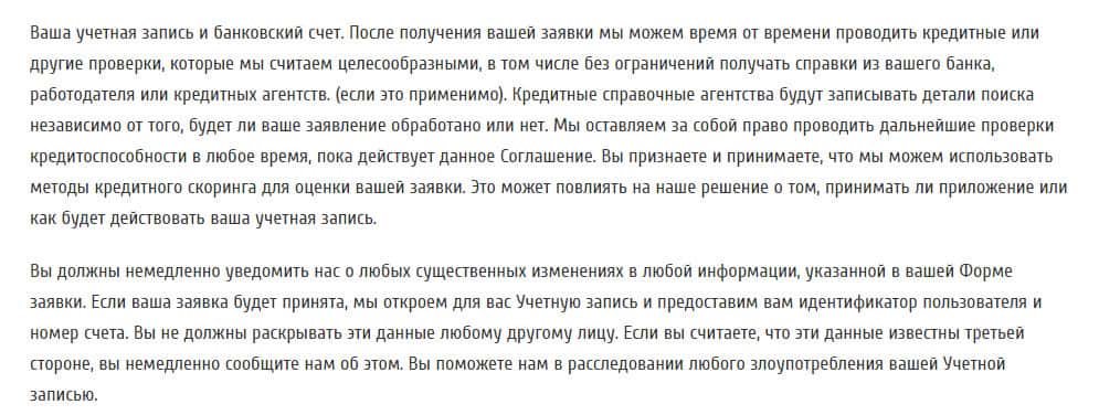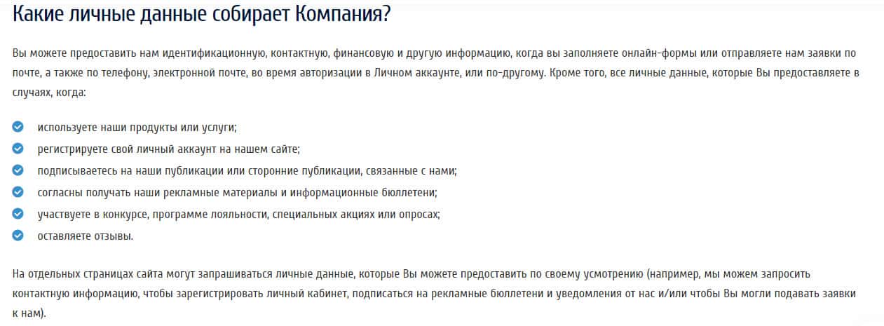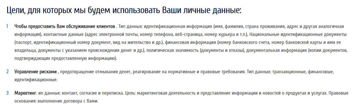 Немного спустившись ниже, мы наблюдаем цели, для которых мошенническая контора собирает Ваши личные данные. А собирают они их, как сами утверждают в документе на их официальном сайте, для того, чтобы предоставить "лучшее" обслуживание, как клиента, управлять рисками и маркетинг, для того, чтобы предъявлять Вам свои продукты в их конторе.