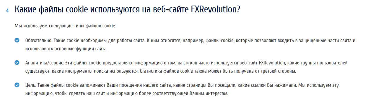 Мошенники из преступной организации под названием FXRevolution io рассказывают о файлах куки на своём мошенническом сайте, в котором, для данной темы, отвели отдельную вкладку а разделе "Политика". Что примечательно, то это перевод текста на русский язык. На сайте мошенников есть несколько языков для разного типа населения, но перевод не дает надежд.