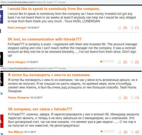 И даже на иностранном сайте несколько человек высказалось по поводу мошеннических действий лохотронщиков ФХ Трейд 777. Один из клиентов зарегистрировался и вложил 5 000 долларов. После пополнения счета менеджер перестал брать трубку и его контакты просто поставили в игнор. Как он не пытался с ними связаться, все без результатов, тем более что личный кабинет был заблокирован.