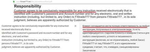 В клиентском соглашении можно выделить одну интересную вещь. Перед тем как клиент начнет работать с кухне ФХ Трейд 777, он подписывает договор, в котором контора начинает с первых же дней обязывать выполнять указания и инструкции, которые будет присылать она клиенту. То есть у клиента не будет выбора сделать что-либо самостоятельно, так как все будет завязано на манипуляторе, которым будет выступать контора FX Trade 777.