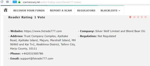 Еще одна информация осталась в интернете о жулье ФХ Трейд 777 на сайте scamrecovery net. Это контактные данные самой конторы и их финансового партнера, который проводил операционную деятельность с деньгами аферистов. Она называется Blond Bear OU. Достаточно известная компания среди форекс-мошенников. А вот собственно и сами данные: