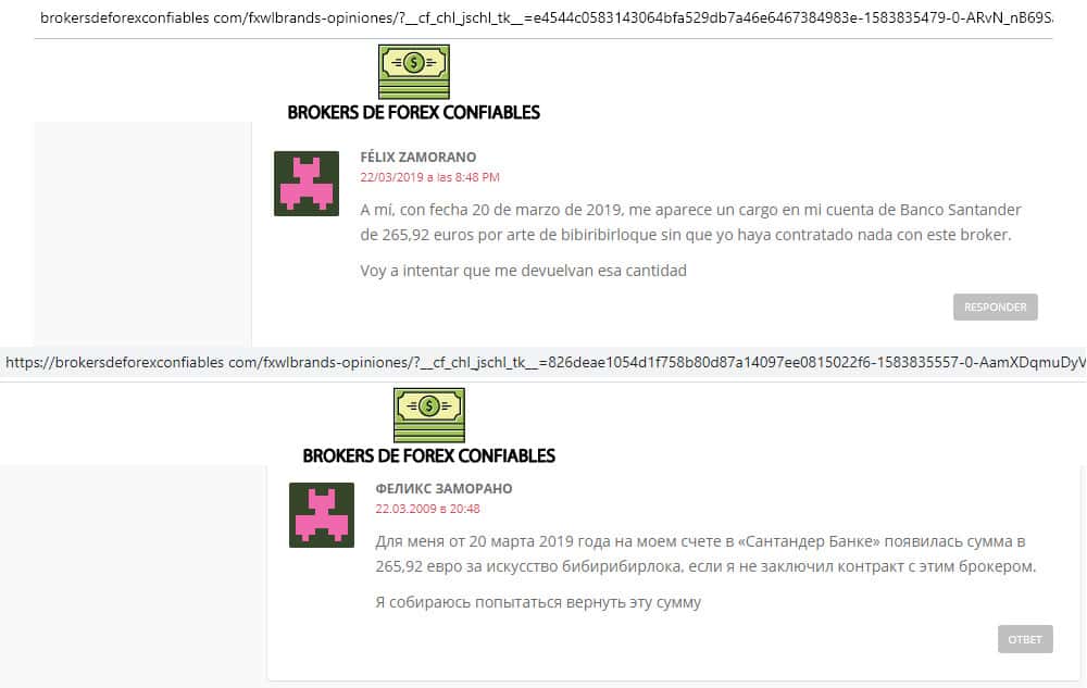 В данном отзыве человек рассказывает, как контора FXWLBrands обворовала его на сумму свыше 250 евро и он пытается теперь ее вернуть любыми путями. Он заключил контракт с этим брокером и на основании этого пытается привлечь их к судебному разбирательству. Все операции были произведены через банк Сантандер Банк.