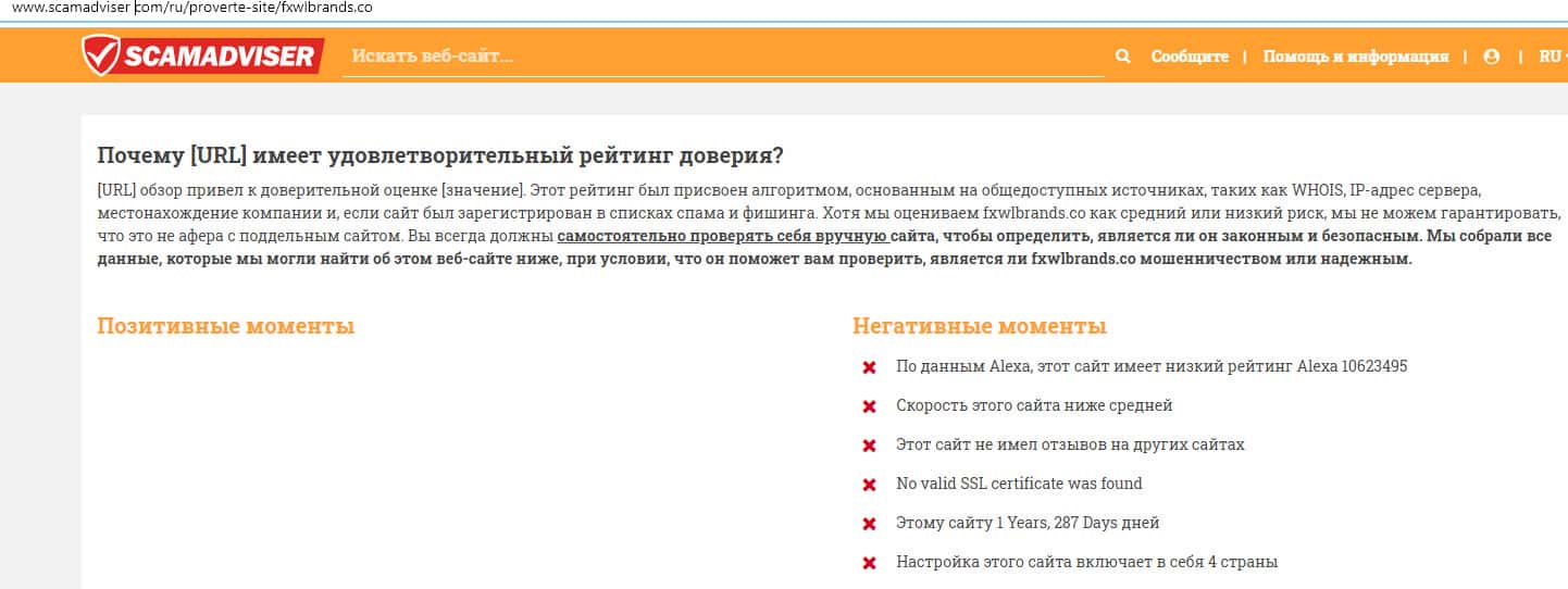Далее представлен список негативных моментов, которые были замечены в процессе анализа сайта конторы FXWLBrands. Жулики имеют очень низкий рейтинг, скорость сайта очень медленная, сайт не имеет достаточное количество отзывов в интернете, а также в настройке сайта использовался VPN.