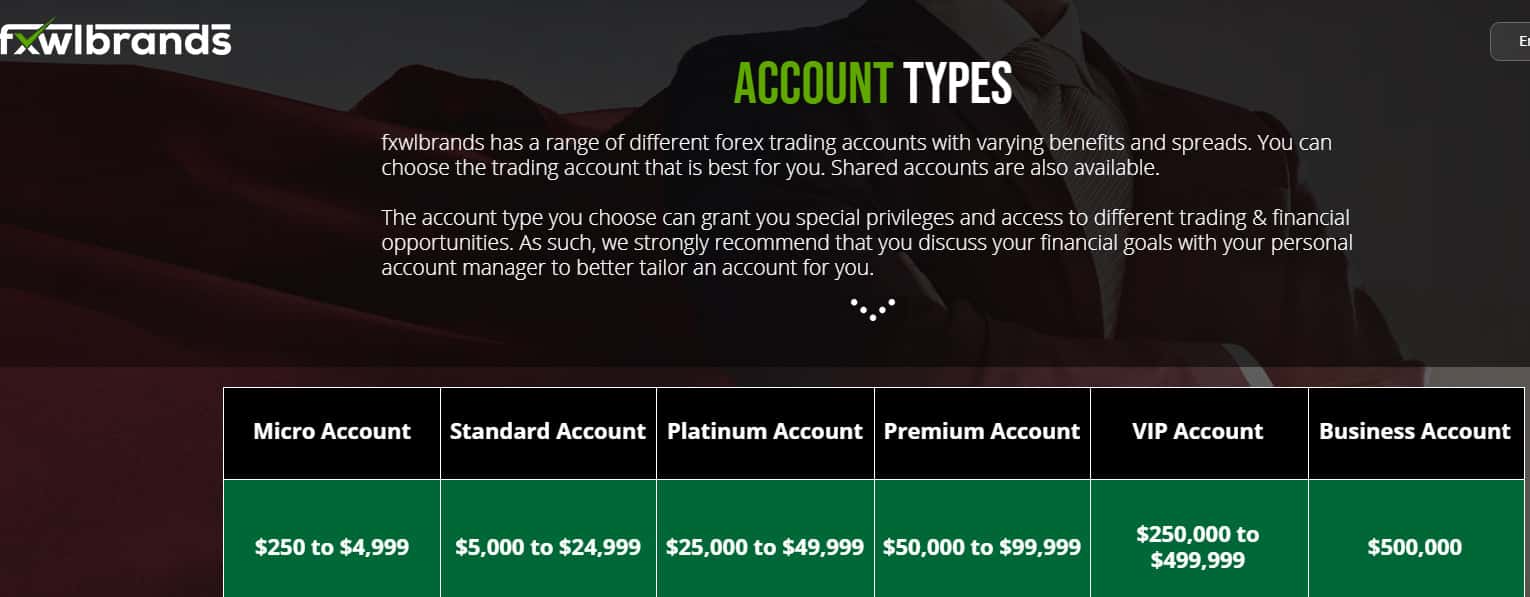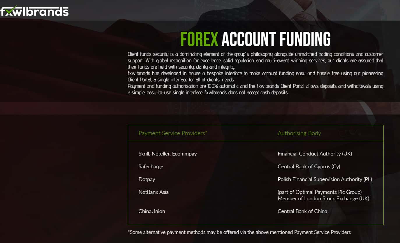Ниже представлена информация касательно форекс-счетов, которые аферисты FXWLBrands предлагают своим клиентам. Жулики используют якобы основные банки для открытия счета в зависимости от региона открытия. Но это все является обычным текстом, так как данную информацию невозможно подтвердить.