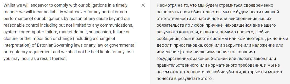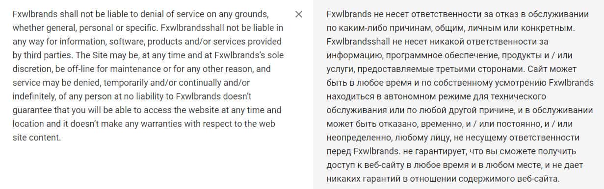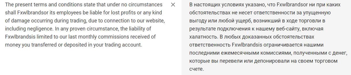 Также мошенники FXWLBrands указывают, что будут стремиться своевременно выполнять свои обязательства, но оставляют за собой лазейку, не нести ответственность, если у них не получится этого делать. По причине ненадлежащих предоставляемых услуг, трейдер может потерять все деньги безвозвратно.