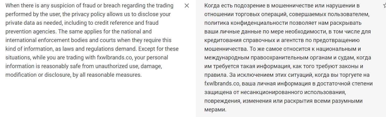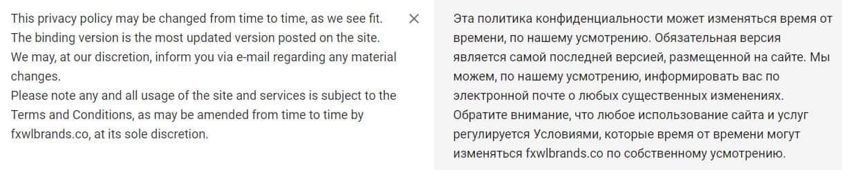 Мошенническая контора FXWLBrands также уверяет, что они в любой момент могут изменить политику конфиденциальности, при чем на свое усмотрение. Они могут сделать так, что вы не сможете подкопаться по закону к их работе, а соответственно шансов доказать правоту касательно ситуации с утечкой информации не получится.
