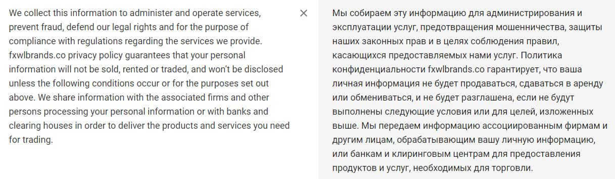 Шулерская контора ФХ ВЛ Брендс указывает в своей политике конфиденциальности, что она гарантирует, что информация о клиентах не будет продаваться, но в тоже время может передавать информацию ассоциированным фирмам и другим лицам, которые могут использовать ее в корыстных целях.