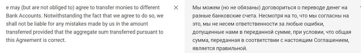 Возникнуть проблемы могут и с выводом средств, при чем жулики FXWLBrands спишут все именно на часть из своего дырявого договора. Они указывают, что могут договориться о переводе средств со счета клиента, но в тоже время, не несут ответственности, если вдруг укажут не ту сумму в переводе, либо вообще реквизиты.