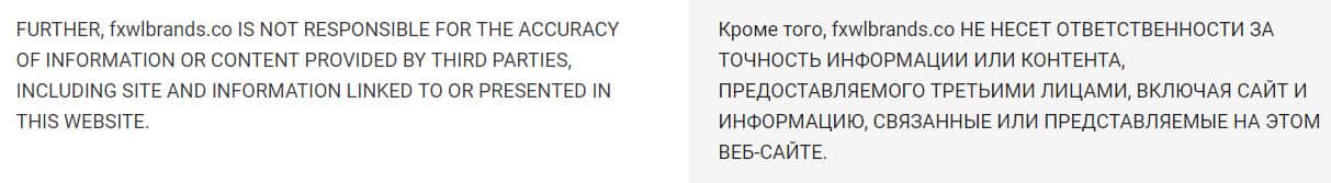 Мошенники FXWLBrands также не несет ответственности за точность информации и вообще данных, которые указаны на их официальном сайте. Это касается и ссылок на сторонние ресурсы, то есть это обыкновенные рекомендации, где нет никаких гарантий и в случае чего. Афера ФХ ВЛ Брендс не будет нести ответственность.