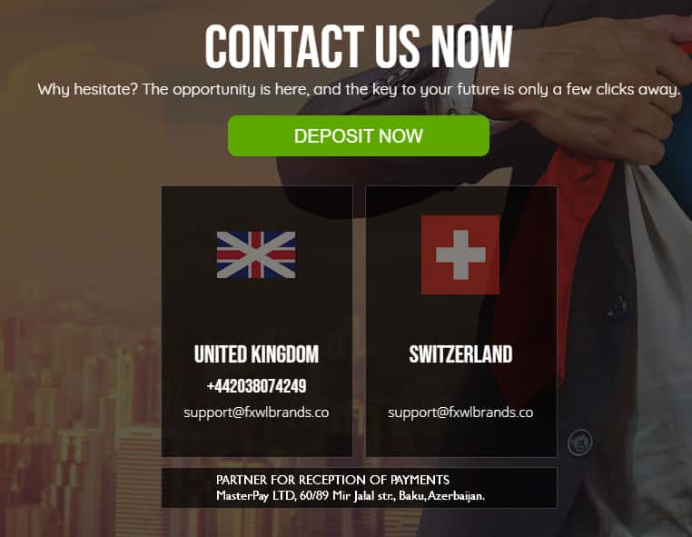 Мошенническая организация FXWLBrands использует различные уловки, чтобы войти в доверие к лохам. И также для этого указала некоторые контактные данные, при чем отвечать по ним, они будут только до тех пор, пока вы не положите туда деньги. А вот для ознакомления, мы и решили опубликовать все данные:
