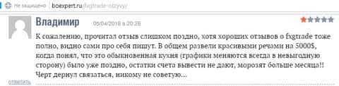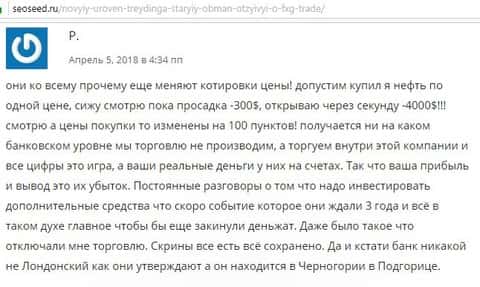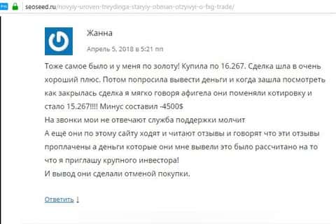 Человек разместил свой пост на одном интернет-портале под статьей о форекс-аферистах ФХГ Трейд. Он указывает проблемы со сделками, которые он совершал. Однажды он открыл на своем счету сделку по нефти и позиция сразу же была в минус 300 долларов, а уже через минуту сразу цифра поменялась на -4000 долларов США, хотя должно быть без изменений. И к нему пришло прозрение, что контора использует кухонные методы для одурачивания своих клиентов, они не имеют никакого выхода на межбанковский и товарный рынок, и прочие финансовые рынки. Вся торговля происходит внутри компании в виде интерактивной игры. Также постоянно требуют вложить деньги, указывая на грядущие супер-сделки.