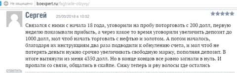 Не смотря на то, что в интернете кишит уже брокерами мошенниками и на жулье продолжают писать жалобы и негативные отзывы, люди все же умудряются влазить в подобные аферы, потому что ими движет жажда халявного дохода, на что и делают упор такие аферисты как ФГХ Трейд. Человек связался с ними, чтобы попробовать поторговать валютой на Форекс-рынке и начал с депозита в 200 долларов. Они постоянно прессовали его, чтобы он вложил больше денег. И сумма уже достигала размера в 1000 долларов. Форекс-шарлатаны стали открывать сделки на нефти и золоте с большим плечом и сразу же счет ушел по маржинколу. Чтобы восстановиться, нужно было докинуть денег и тогда аналитики обещали заработать больше. ну и по старинке снова прогорели. Так им удалось стащить с кармана жертвы лохотрона 4350 долларов и все резко пропали со связи.