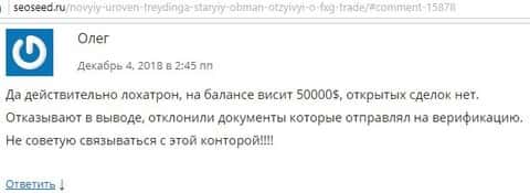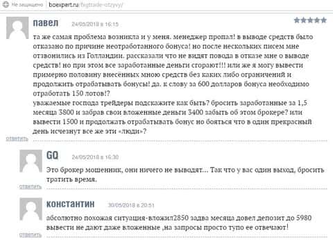 Человек попытал счастье на Форекс-рынке и ему в обзор попалась компания FGX Trade. Он не думал, что все может так сложится именно с ним и поначалу доверял этой конторе. Но все закончилось невыплатой, хотя на счету и лежало около 50 000 долларов. Нам неизвестно сколько он вкладывал до этого, но думаем все же, что много, потому что за такой период с малого депозита невозможно столько заработать. Когда он запросил вывод средств, ему стали наяривать из клиентского отдела и выпрашивали пройти верификацию счета. Клиент согласился с их условиями, но шулера по непонятным причинам отказались их принимать и в добавок к этому не указывают причину. Теперь осталось только надеяться, что кто-то накажет лохотронщиков и помогут вывести украденные деньги.