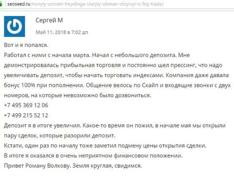 Автор поста под статьей о форекс-мошеннике FGX Trade описал свою историю как он попался к ним на крючок. Он начинал торговлю с этой компанией с небольшого депозита и сразу же торговля начала давать свои плоды, так как аферисты дорисовывали исключительно положительные результаты. Но было одно большое НО - жулье постоянно давило клиента на ввод большей суммы на счет и заманивала дополнительными бонусами. В итоге человек сломался и вложил еще денег. Когда шарлатаны ДЦ ФГХ Трейд поняло, что с клиента нечего взять, то получилась казусная ситуация и аналитики целенаправленно слили весь депозит. Также он подметил, что котировки не совсем совпадают с реальными цифрами и понял, что эта компания использует кухонные методы борьбы с клиентами. Жулик Роман Волков проводил мошенническую схему и звонил с номеров: +74953691206, +74992155212.
