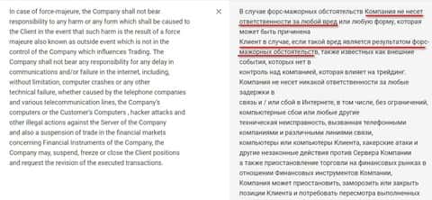 Дилинговые конторы знают толк в своем мошенническом деле и используют клиентское соглашение и договора в качестве инструмента увиливания от будущих проблем. Один из самых распространенных видов отказа от ответственности брокерских форекс-контор это форс-мажорные обстоятельства. Чем и воспользовалась дилинговая кухня FXG Trade. Согласно их договору компания не несет ответственности за любой вред или любую форму, которая может быть причинена клиенту в случае, если такой вред является результатом форс-мажорных обстоятельств. Все выглядит неплохо, но во-первых контора не указала список форс-мажоров, на которые следует опираться при расследования дела и соответственно туда можно вписать любую ситуацию, а во-вторых контора забыла указать тот же самый пункт, только по отношению к клиента к компании. Клиенты ведь тоже живые люди и имеют право на такой вид защиты.