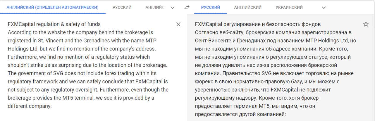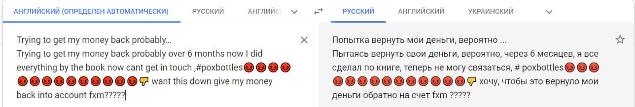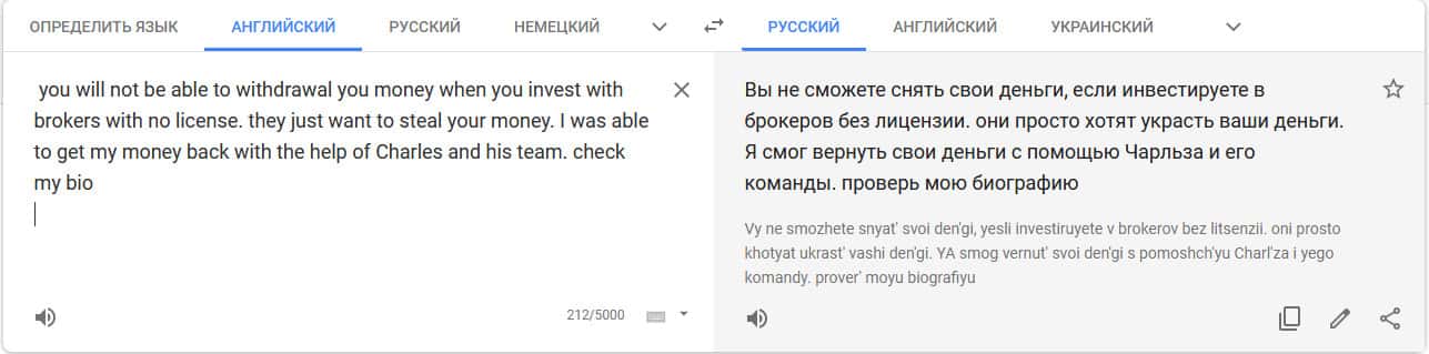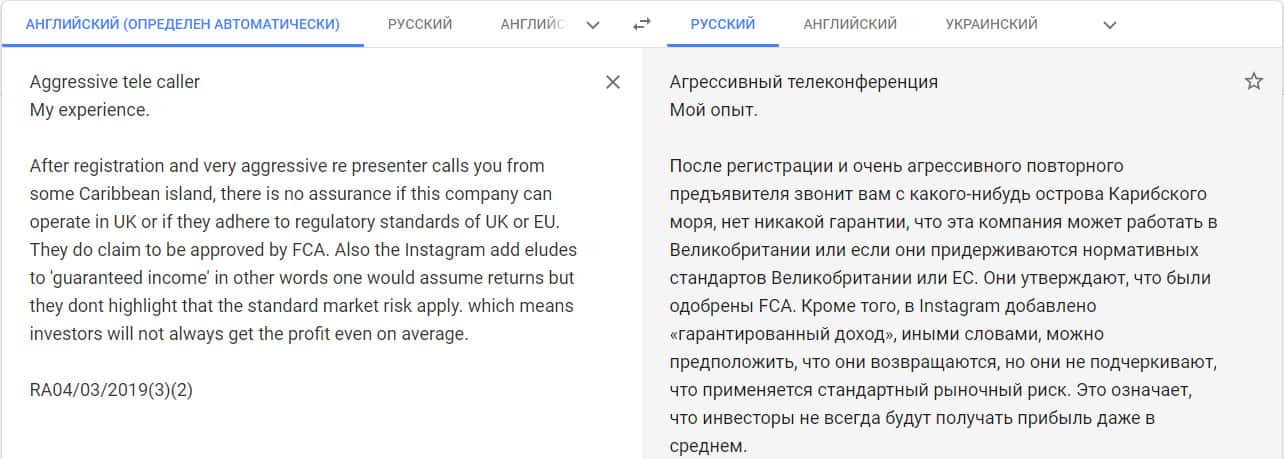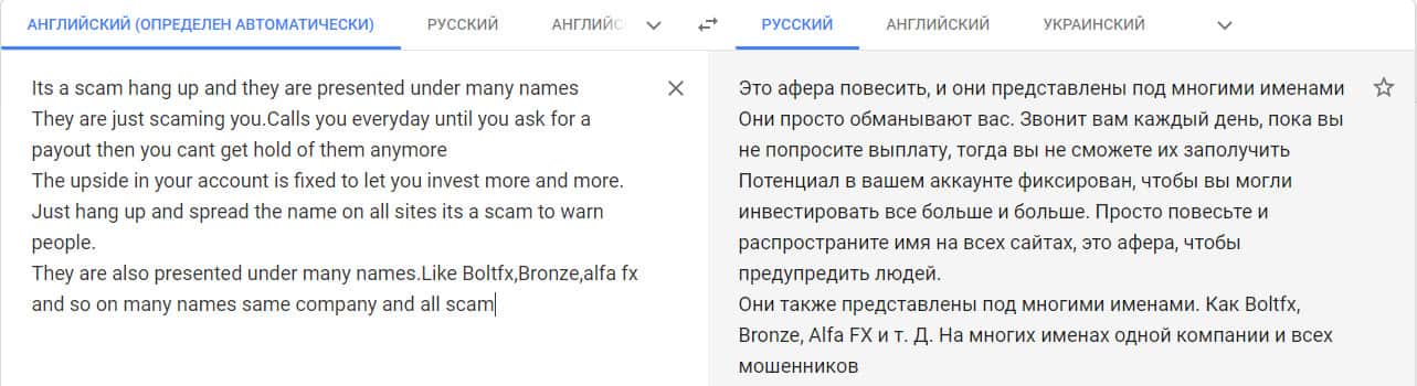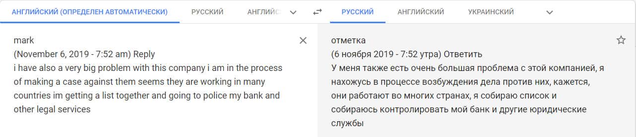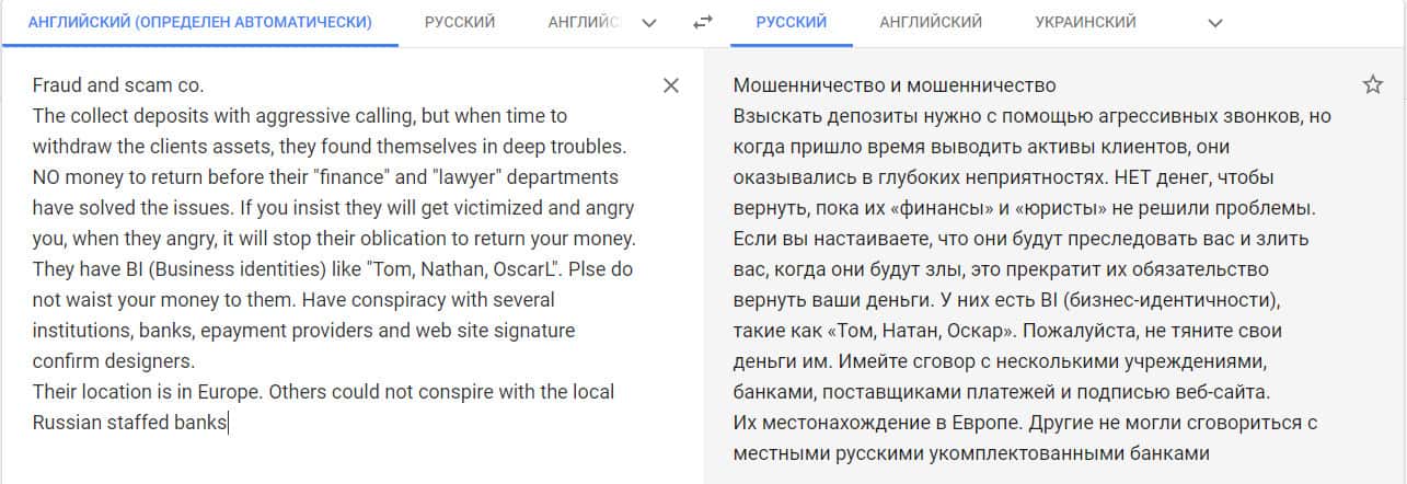 Перевод отзыва о мошенниках на сайте translate.google com.
