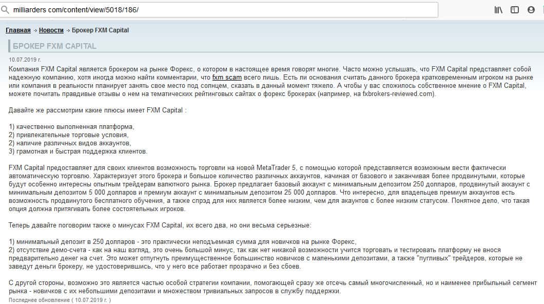 Минимальный депозит для того, чтобы открыть счет в FXM Capital составляет 250 долларов. Такие суммы к рынку вообще не имеют никакого отношения. Статейка заказная. Видимо мошенники вкладывают деньги, чтобы создать себе положительный имидж на таких ресурсах. Не ведитесь на это.