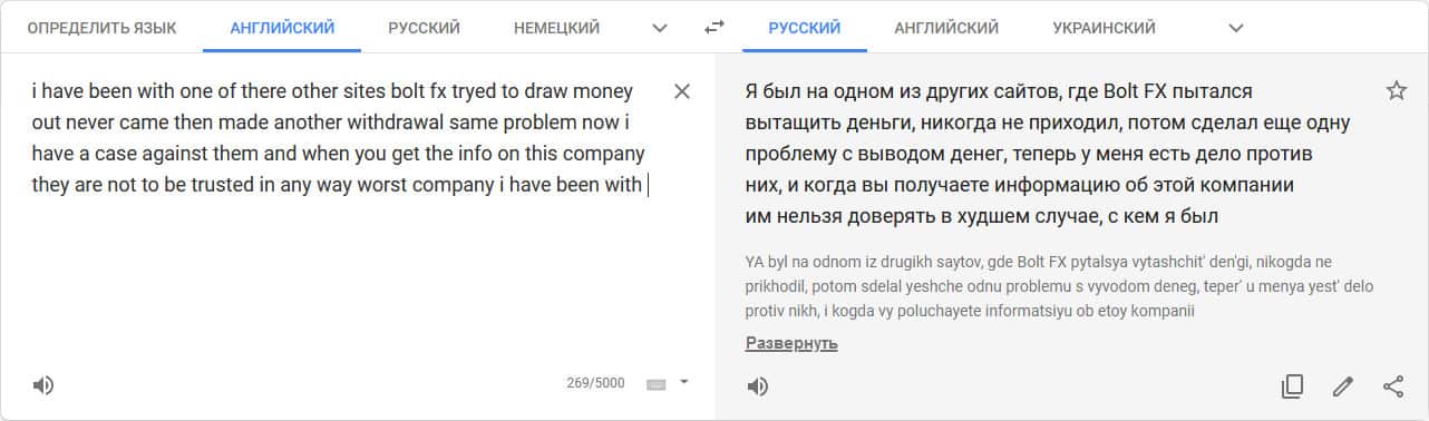 Перевод отзыва о жуликах на сайте translate.google com.