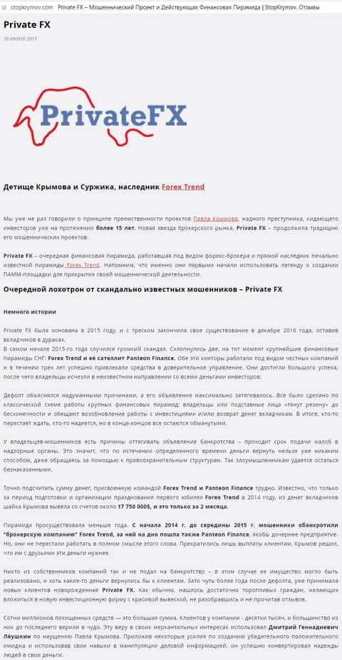Очень интересная статья, раскрывающая истинную суть хайп-проекта ФХ-Приват, который является ничем иным, как реинкарнацией печально известного Forex Trend, который уже прославился как на просторах Интернета, так и по всему миру. Прославился тем, что действовал как пирамида и лишил выплат всех своих вкладчиков. В этом плане, детище печально известного Павла Крымова FX-Private – прямой продолжатель пирамиды Forex Trend, о чём свидетельствует то, что ПАММ-площадка ФХ-Приват работала на движке упомянутого Forex Trend. Да и сами ПАММ-счета для удобного выкачивания бабла придумали именно Крымов и Компания. Кроме этого, они выкупили несколько форумов, среди которых упомянутый выше mmgp.ru, а также бесконечное количество позитивных отзывов о пирамиде, что было сделано исключительно для отбеливания репутации Крымова и самих FX-Private, чтобы на этот лохотрон велись всё больше и больше доверчивых пользователей Сети.