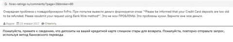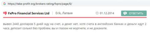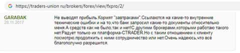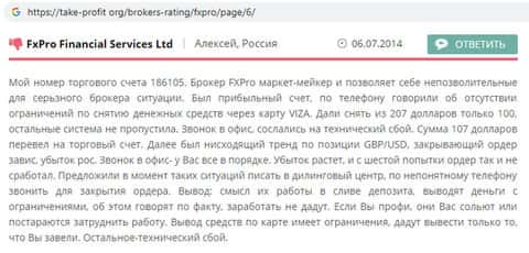 Клиент, оставивший коммент на forex-raitings ru, думал вывести им же заработанные деньги с платформы FxPro Direct. Когда вывод выигрыша на реальную карту провалился по дурацкой причине, мужчина додумался почитать отзывы. Но было уже поздно, собственные средства он не вернет.