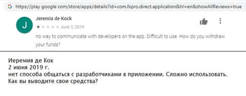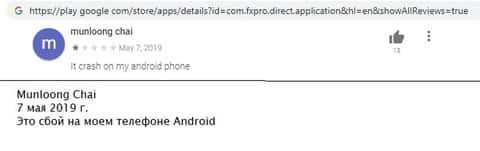 На гугл плэй появляются отзывы о работе финансового инструмента ФхПро Директ по выкачке клиентских денег. Снова жалобы на запрет вывода средств. Имея дело с этими аферистами – хоть на компьютере, хоть на телефоне – вкладчик в любом случае потеряет всё, что вложит.