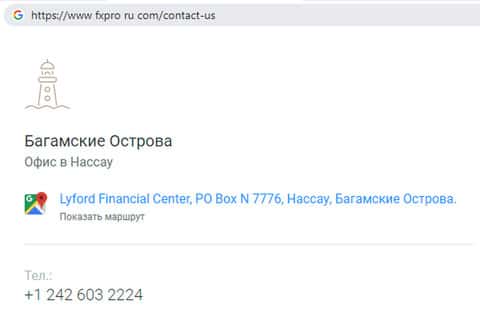Шарашка ФхПро Директ зарегистрирована на Багамских островах. Поскольку мошенники не удосужились предоставить контакты на своем сайте, находим телефон конторы, посетив владельца этой и других подобных жульнических площадок: