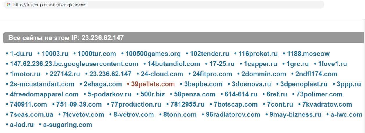 Так же на этом сайте есть информация о айпи адресе мошенников. Оказалось, что вместе с сайтом фирмы FXCMGlobe этот айпи используют множество компаний, которые так же являются мошенниками, не исключено, что все эти проекты принадлежат одним и тем же людям, так как фирма разными способами старается развести пользователей.