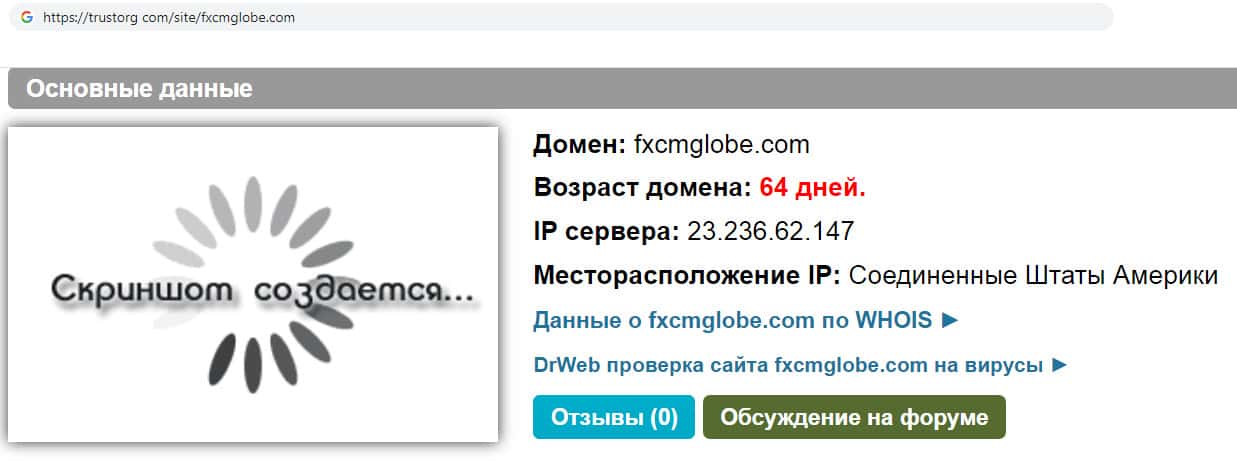 Мы проверили сайт компании разводил FXCMGlobe через интернет ресурс "Доверие в Сети", и оказалось, что компания существует всего 64 дня. И сразу становится понятно, что брокер мошенник, так как врёт о своём опыте работы, хотя сам существует чуть более 2 месяцев. Это так же объясняет малое количество информации о фирме.