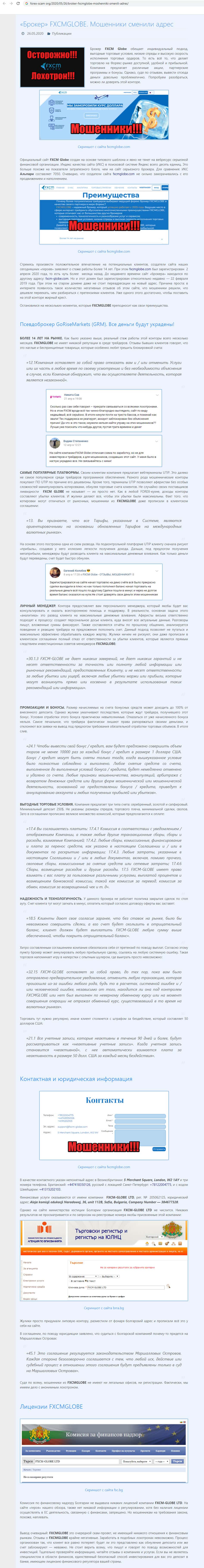 - Фирма псевдоброкера ФХСМ Глобе предоставляет лживую информацию о себе