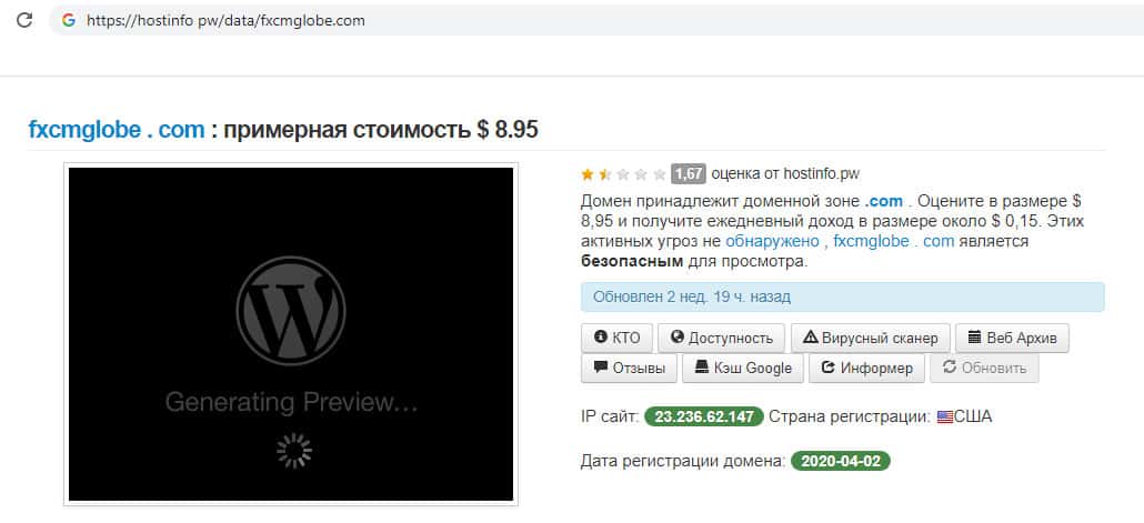 В сети мы нашли информацию о сайте мошенников ФХСМ Глобе. В ней обозревающий сайт признал интернет ресурс компании безопасным для посещения, так же добавил информацию о стоимости. Сайт стоит чуть более 8 долларов, а ежедневная прибыль сайта составляет 15 центов. Как может сайт "великого" брокера стоить менее 9 долларов?