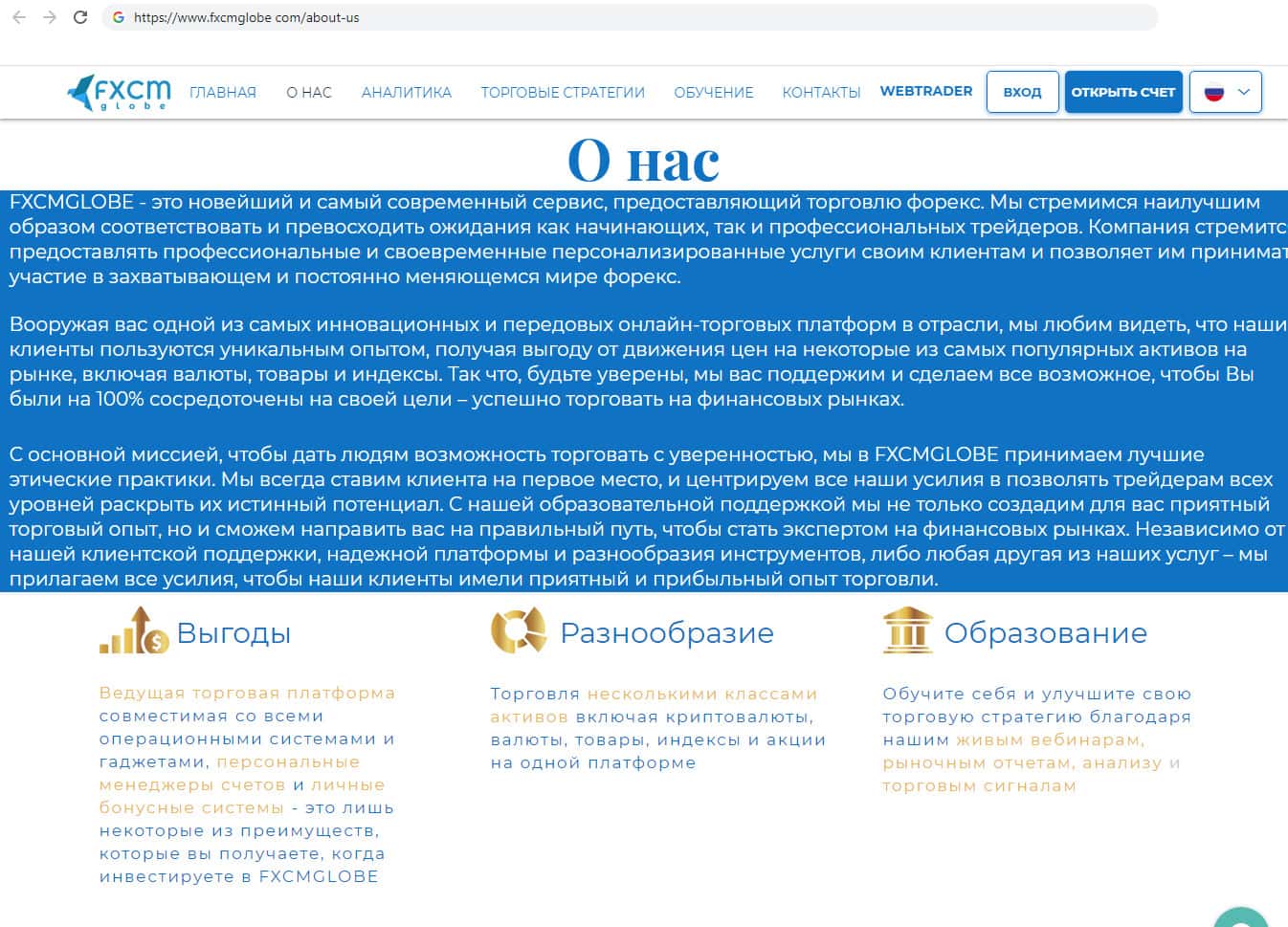 На сайте компании мошенников ФХСМ Глобеесть пункт "О нас" в котором фирма лестно отзывается о себе. Она называет себя новейшим современным сервисом, который предоставляет для клиентов самые выгодные условия. Но эта информация просто наживка для доверчивых пользователей, которые могут поверить в эту чушь.